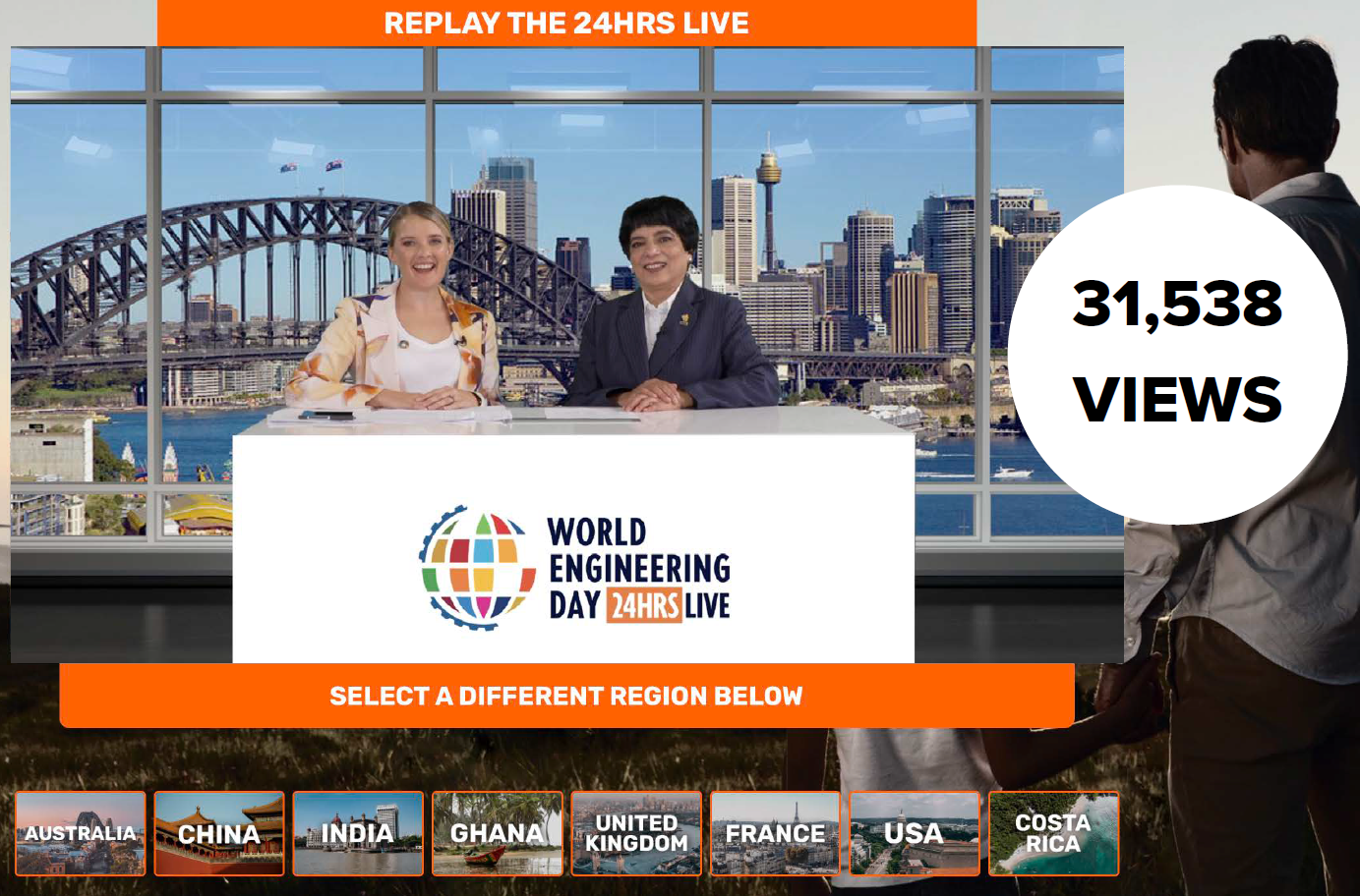 This amazing international celebration was generously supported by our international partners – UNESCO, International Federation of Consulting Engineers (FIDIC), International Federation of Engineering Education Societies (IFEES), Global Engineering Deans Council (GEDC). International Engineering Alliance (IEA), International Network for Women Engineers and Scientists (INWES) and Engineers Without Borders (EWB). We also appreciate support from the members, associates and affiliates of WFEO that provided videos and messages that were played during the 24 Hour Live Event.