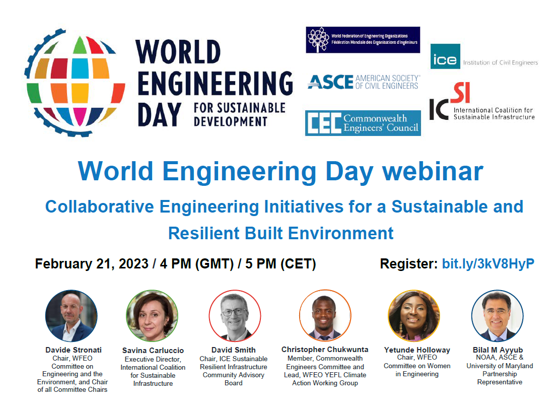 WFEO, the International Coalition for Sustainable Infrastructure (ICSI), the Commonwealth Engineers’ Council (CEC), the American Society of Civil Engineers (ASCE) and the Institution of Civil Engineers (ICE) organized the webinar “Collaborative Engineering Initiatives for a Sustainable and Resilient Built Environment” on 21 February 2023, in ...