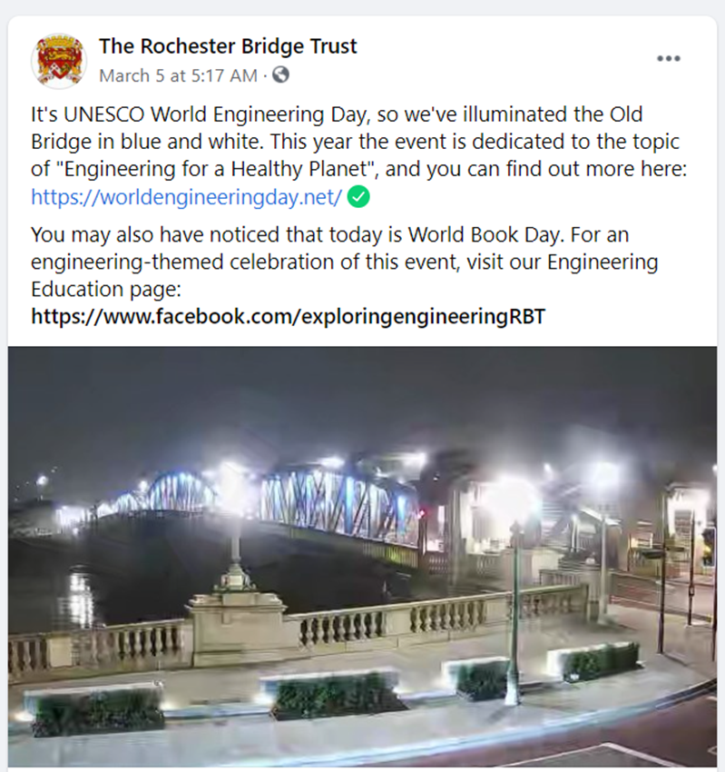 The Rochester Bridge in the UK was lit up in celebration. The results of the event are on www.worldengineeringday.net and are summarized in the following presentations.