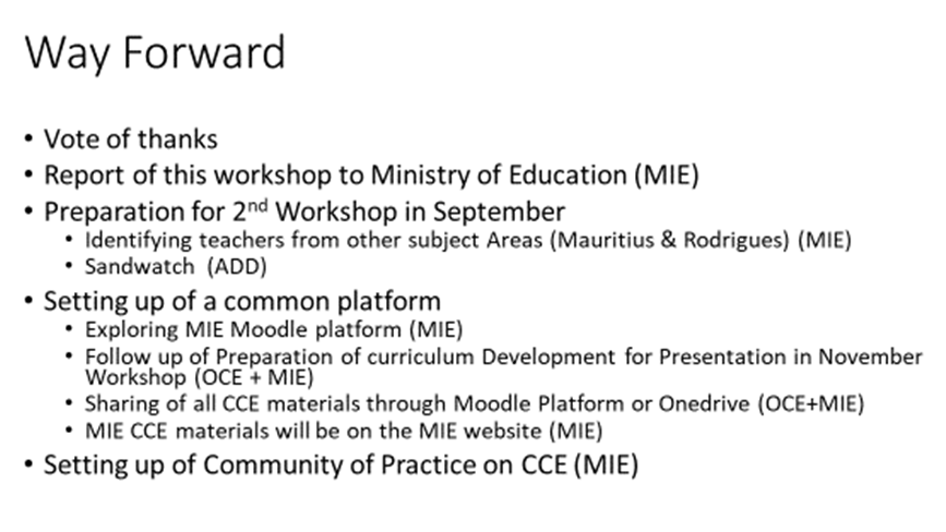 - A five day on site training workshop with educators from OCE travelling to Mauritius, and teachers from Mauritius and Rodrigues attending in person, scheduled for November 2021.