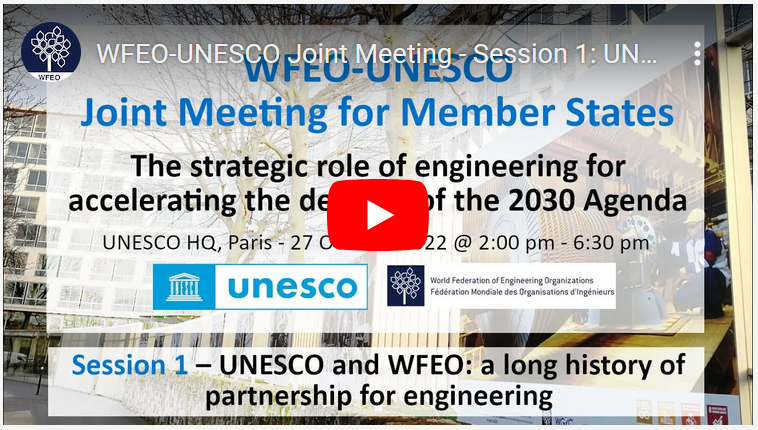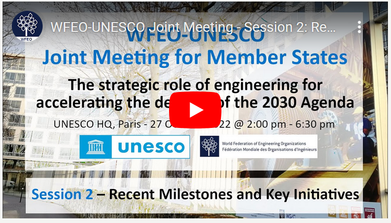 This joint event presented the UNESCO-WFEO partnership and contributions to the SDGs by working with Member States, especially on engineering capacity building and education, and how it is relevant to the variety of regional and national contexts with regard to building more inclusive and responsible communities. It took place at UNESCO Headquarters in Paris, Room IV, Thursday 27 October 2022.
