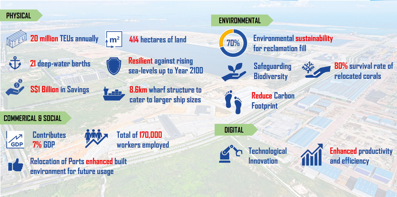 The Tuas Port Phase 1 project entailed the fabrication of 221 10-storey high caissons, construction of 8.6 km of wharf, soil improvement of 414 Ha of land of which 294 Ha were newly reclaimed dredging of the Temasek Fairway and Tuas Basins to – 23 m Chart Datum, and involved a total of 34 million man-hours, with the support of over 450 companies.Overview of Tuas Port Phase 1 (TPP1)
