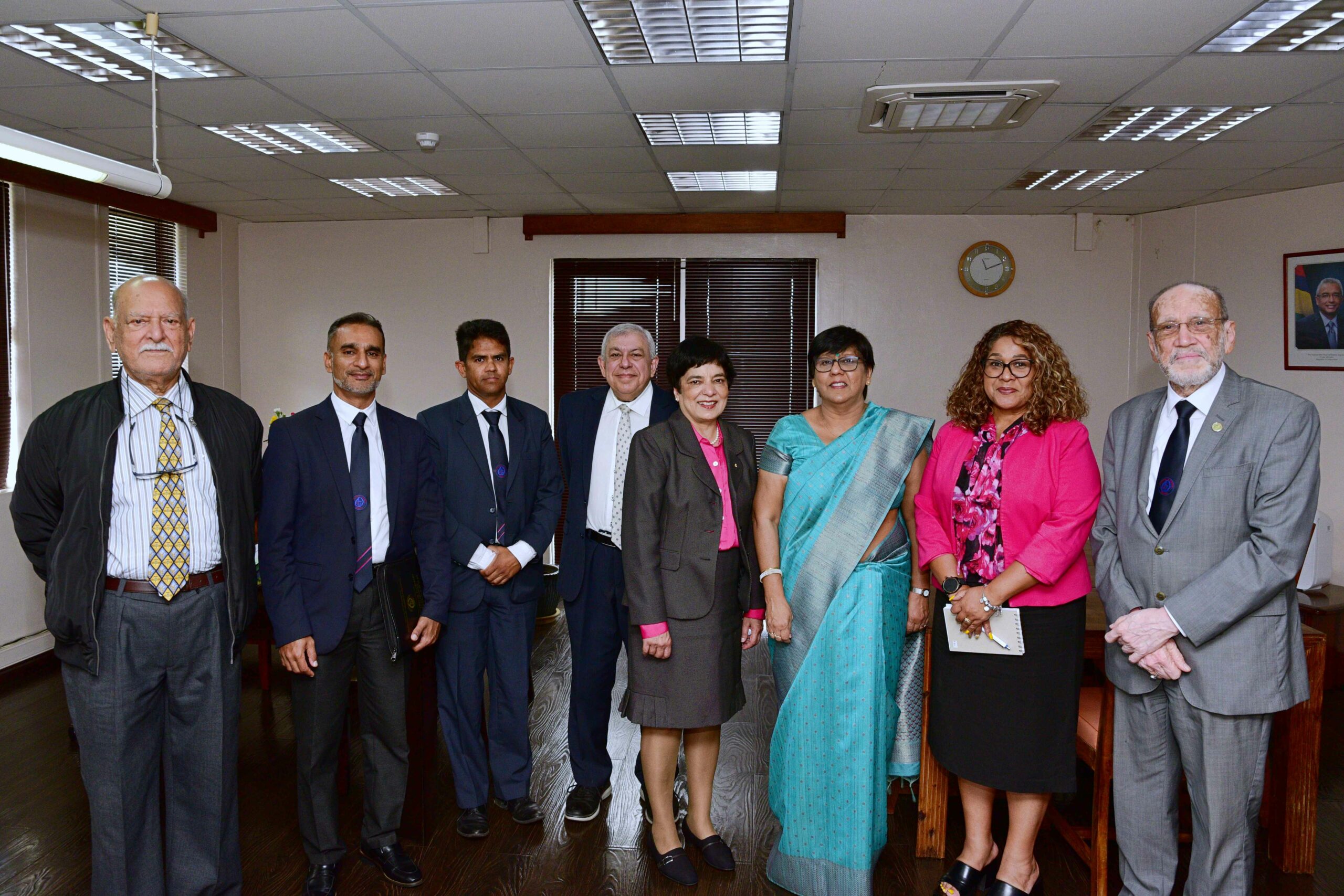 IEM Leaders meet the Vice Prime Minister and Minster for Education Tertiary Education, Science and Technology, 12 September 2024, L to R: Mr Jagadish Soobarah, Mr Rooben Maran, President IEM, Mr Takesh Bucktowar, IEM Council Member, Dr Rustom Kanga, Former WFEO President Dr Marlene Kanga, The Honourable Mrs Leela Devi Dookun Luchoomun, Department Chief Executive, Mr Raj Prayag, Vice President IEM, President