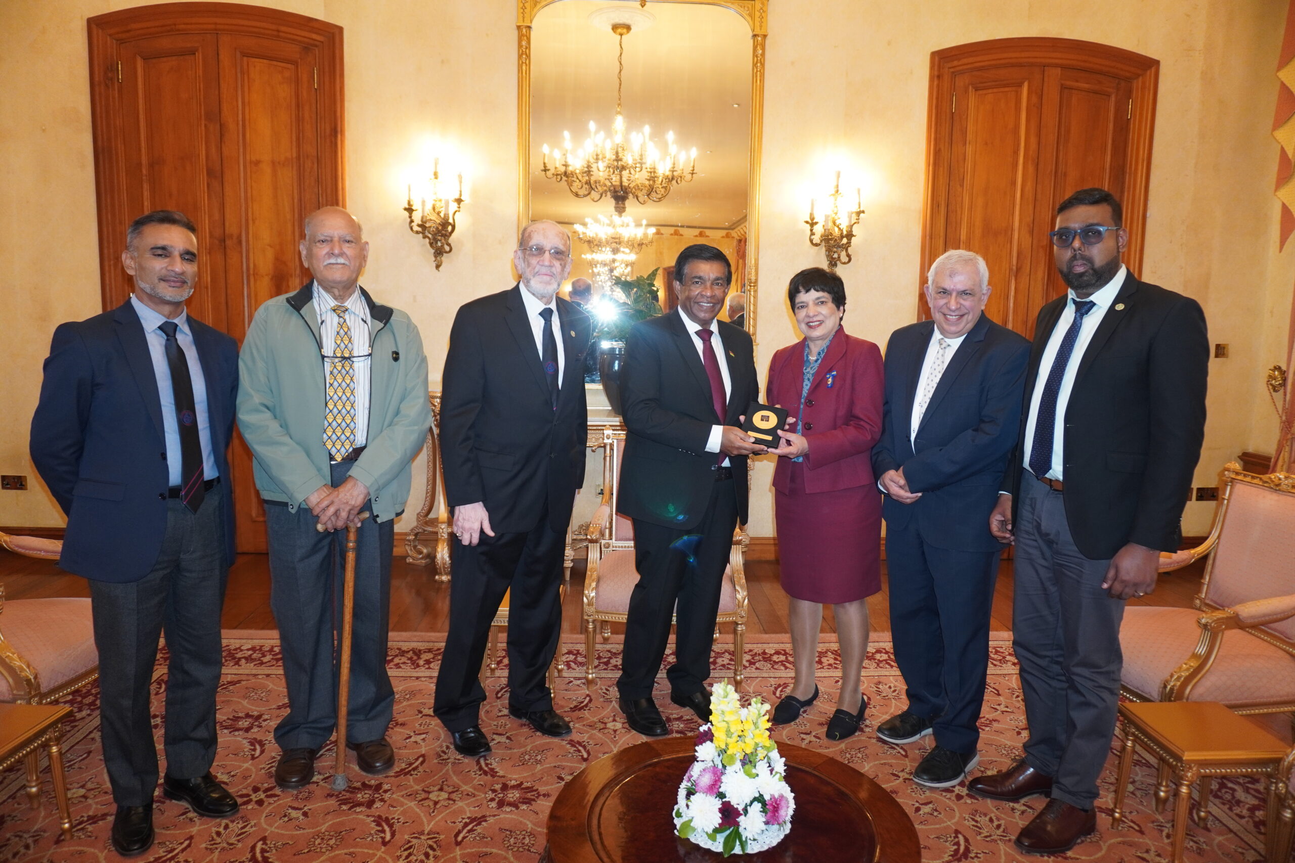 IEM Leaders meet His Excellency, the President of the Republic of Mauritius 13 September 2024, L to R: Mr Rooben Maran, President IEM, Mr Jagadish Soobarah, Mr Raj Prayag, Vice President IEM, President of the Republic of Mauritius His Excellency Mr Prithvirajsing Roopun, Former WFEO President Dr Marlene Kanga, Dr Rustom Kanga, Mr Yashveer Takory, IEM Council member