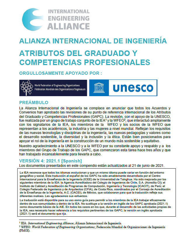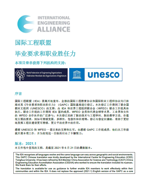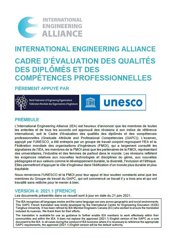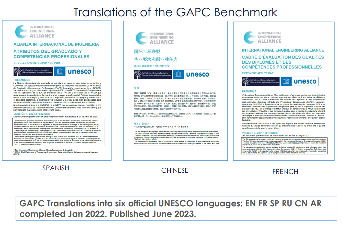 WFEO subsequently engaged with ICEE for the translations of the GAPC into the six official UNESCO languages including French, Spanish. Arabic, Russian and Chinese. These translations were completed in January 2022 and reviewed by IEA Signatories. The translations into French, Spanish and Chinese were published in June 2023. Translations into Russian and Arabic are being reviewed by the relevant IEA signatories and will be published shortly. IEA and WFEO appreciate the contribution of the International Centre for Engineering Education (ICEE) Tsinghua University, to this effort, which supports the global engineering community.