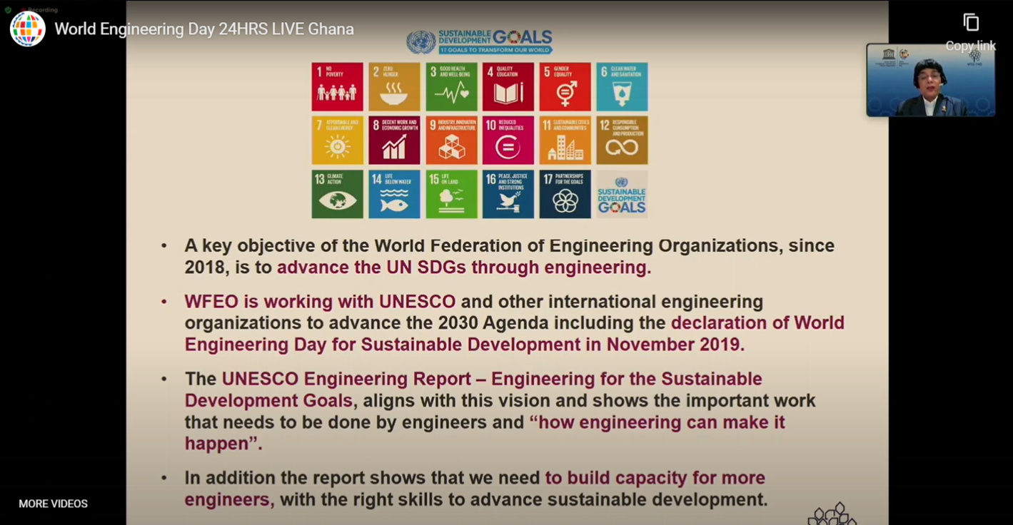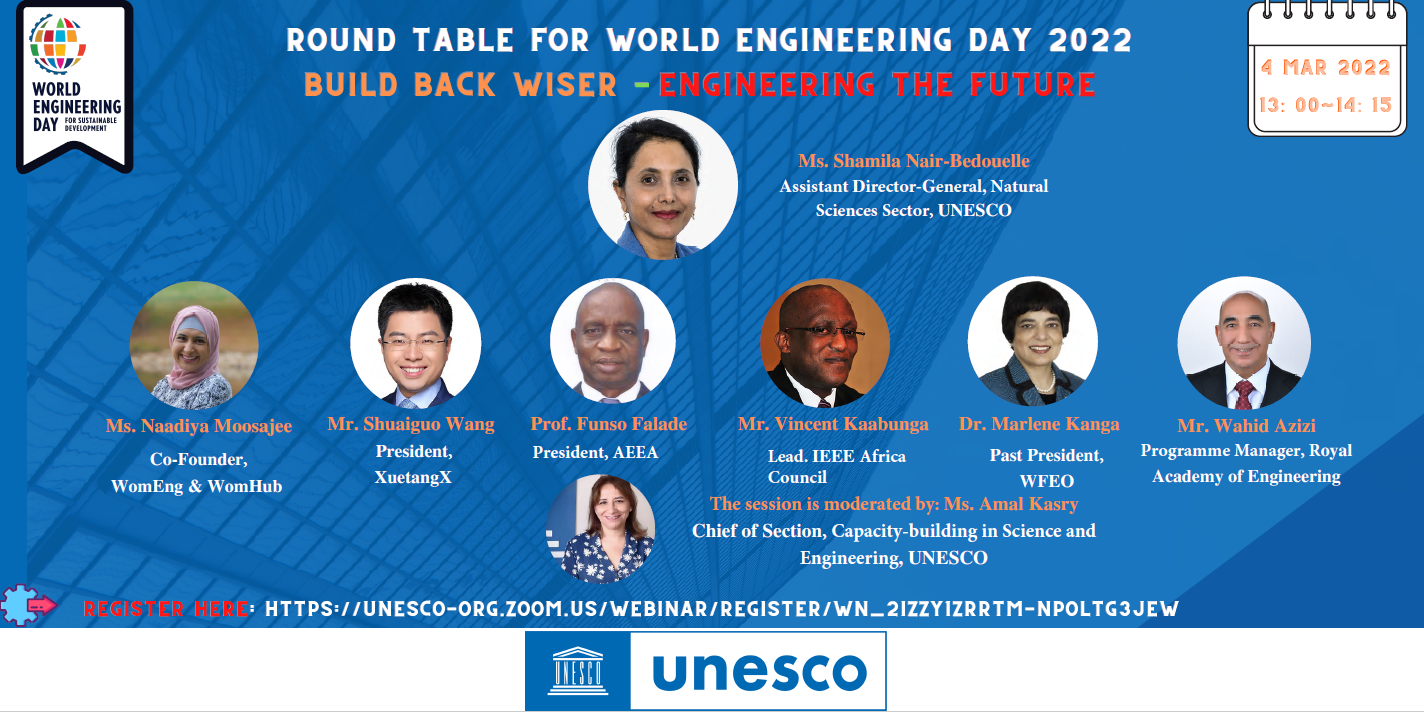 The UNESCO Natural Sciences Sector hosted on 4 March 2022 an international roundtable to celebrate World Engineering Day for Sustainable development 2022. The Theme of the Round table was aligned with the theme of the 2022 celebrations: “Build Back Wiser – Engineering the Future” and asked the important question: “What can we do to Engineer the Future towards the Sustainable Development Goals? What tools are available?”