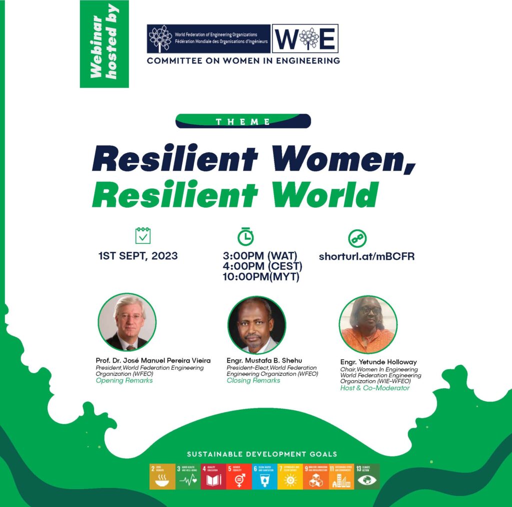The WFEO Committee on Women in Engineering in collaboration with the International Network of Women Engineers and Scientists (INWES), the International Coalition for Sustainable Infrastructure (ICSI), the Institution of Civil Engineers UK, the Engineering Council of South Africa, the Nigerian Society of Engineers, and the Ghana Institution of Engineers, organized the webinar “Resilient Women, Resilient World” on 1st September 2023.
