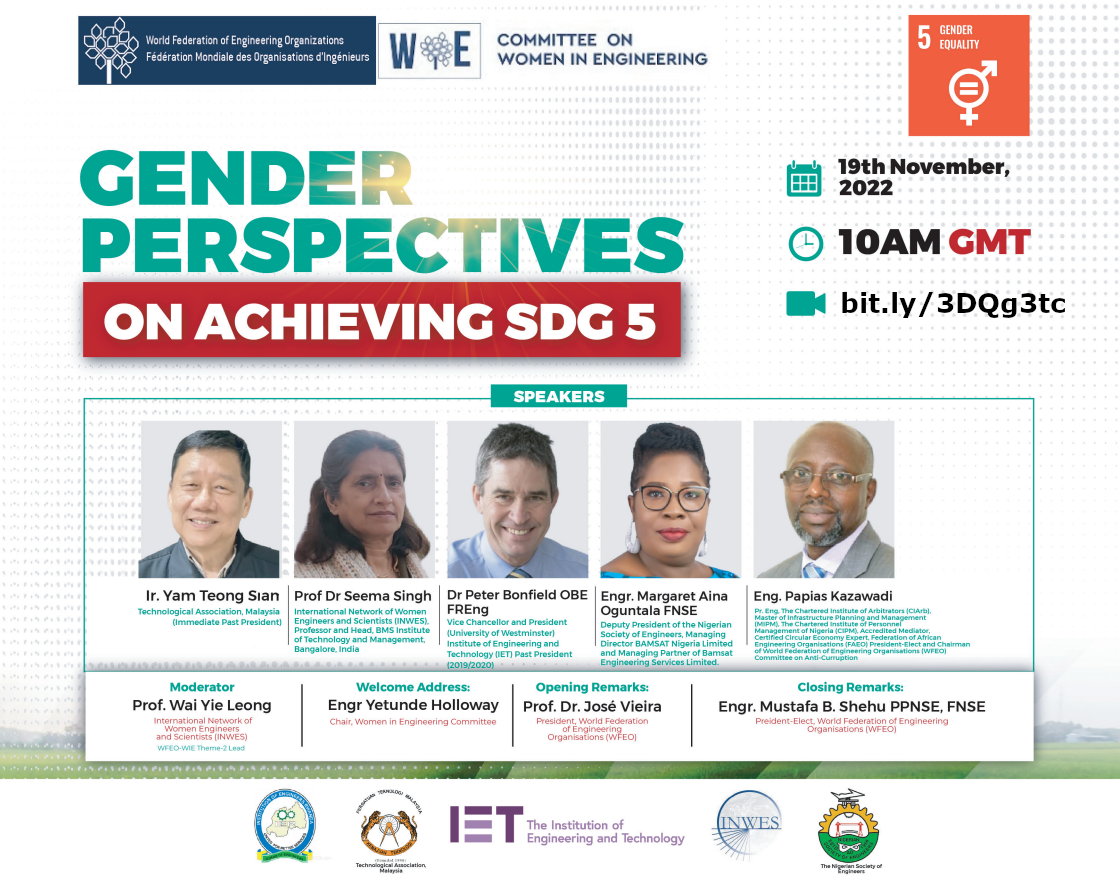 The WFEO Committee on Women in Engineering in collaboration with the Institution of Engineering and Technology (IET), the International Network of Women Engineers and Scientists (INWES), the Nigerian Society of Engineers (NSE), and the Technological Association, Malaysia, organized the webinar “Gender Perspectives on Achieving the SDG 5” on 19 November 2022, to celebrate International Men’s Day.