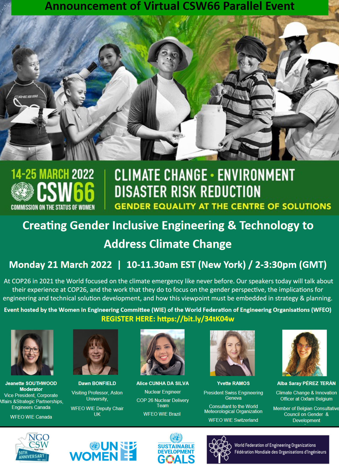 The WFEO Committee on Women in Engineering (WIE) organized the Virtual CSW66 Parallel Event “Creating Gender Inclusive Engineering & Technology to Address Climate Change” on Monday 21 March 2022.