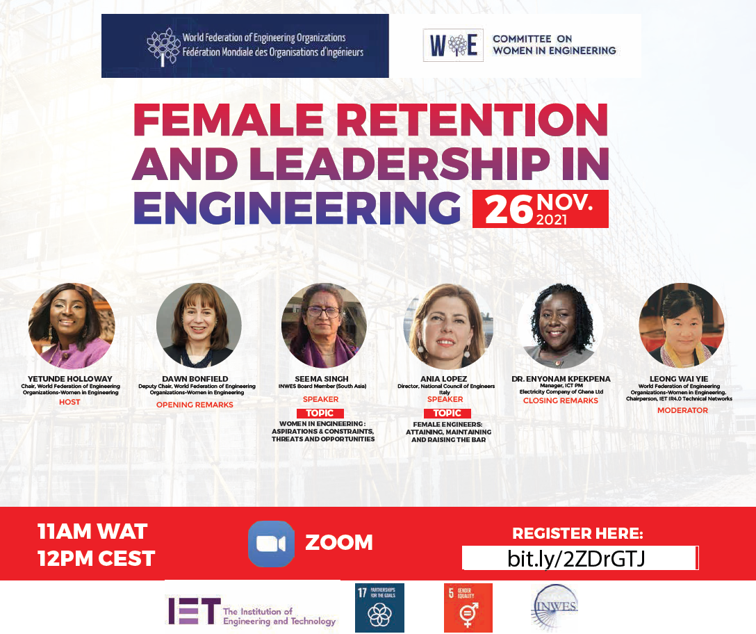 The WFEO Committee on Women in Engineering in collaboration with the Institution of Engineering and Technology (IET) and the International Network of Women Engineers and Scientists (INWES) organized the webinar “Female Retention and Leadership in Engineering” on 26 November 2021.