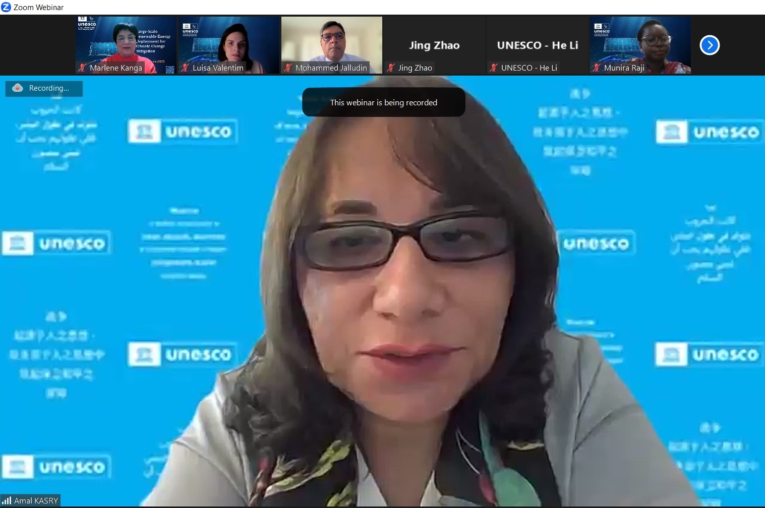 Dr Amal Kasry, Chief of the Basic Science, Innovation, Research and Engineering Section, Natural Sciences Sector, UNESCO, opens the UNESCO UNITWIN Webinar on Large-Scale Renewable Energy Deployment for Climate Change Mitigation, 10 July 2023