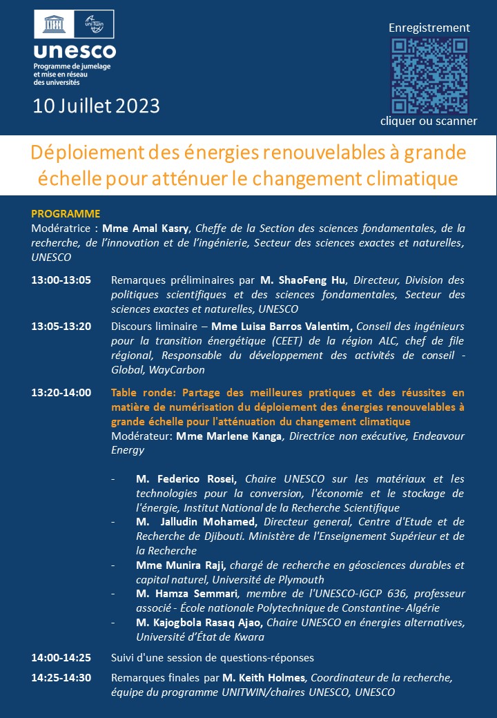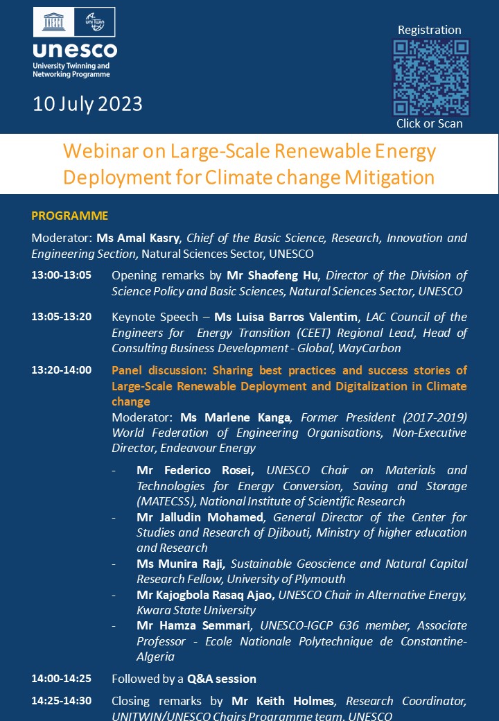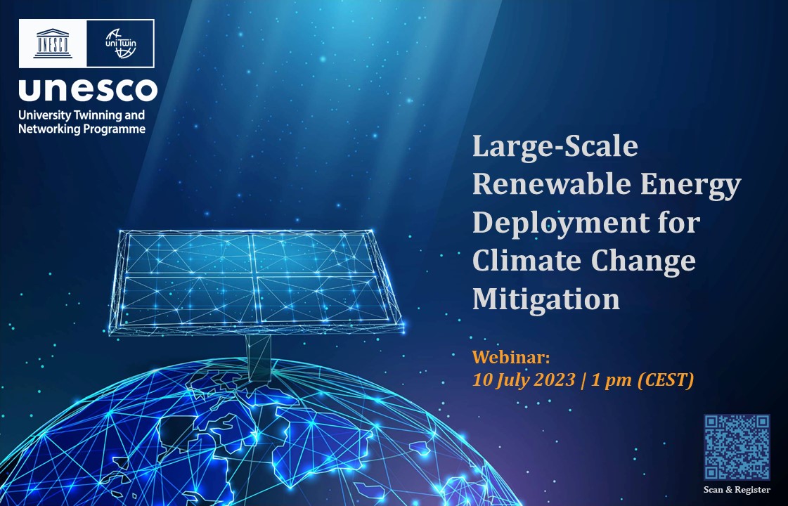 The UNESCO Capacity Building Section, Natural Sciences Sector hosted a webinar on Large-Scale Renewable Energy Deployment for Climate Change Mitigation, on 10 July 2023, as part of its the UNITWIN/UNESCO Chairs Programme.