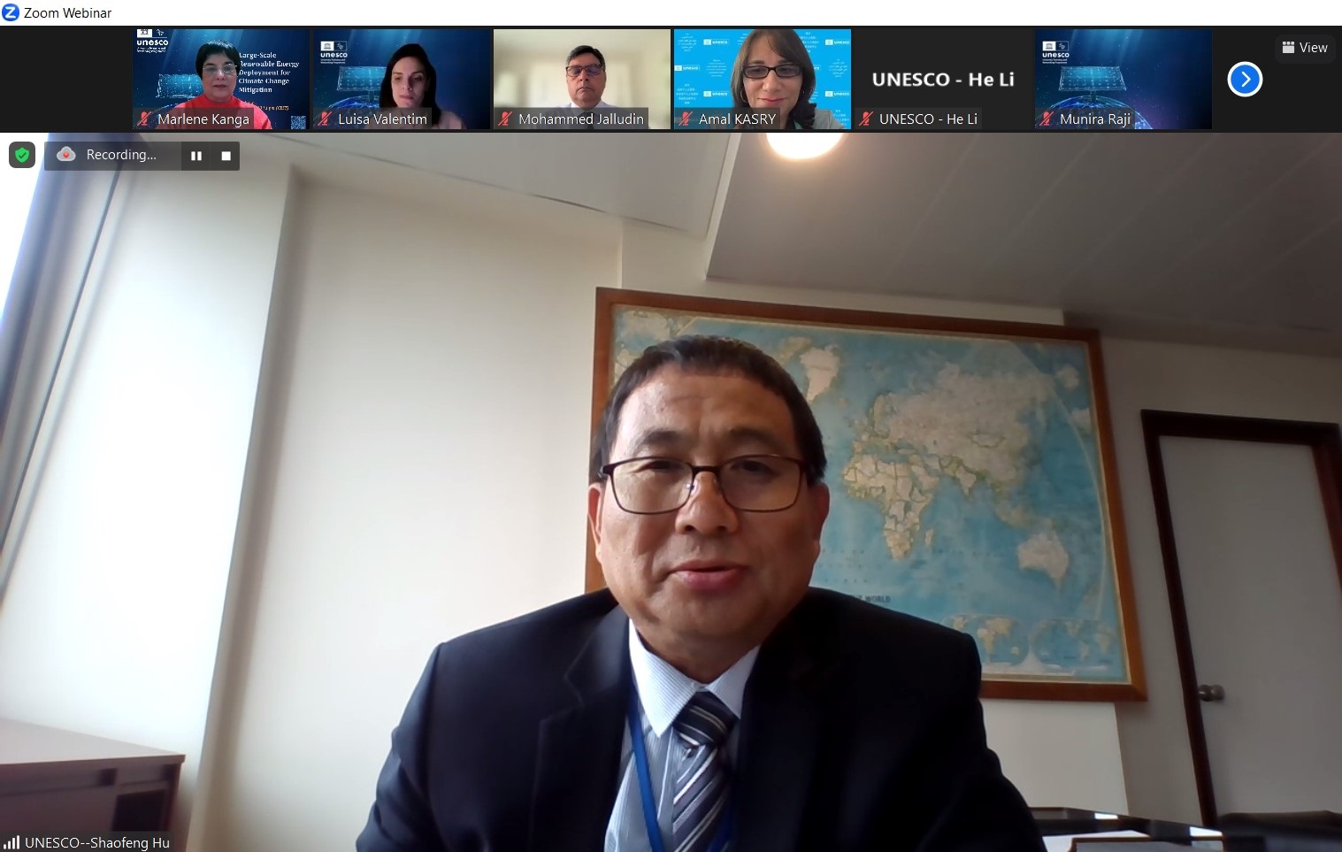Mr Shaofeng Hu, Director pf the Division of Science Policy and Basic Sciences, Natural Sciences Sector, UNESCO, delivers opening remarks at the UNESCO UNITWIN Webinar on Large-Scale Renewable Energy Deployment for Climate Change Mitigation, 10 July 2023