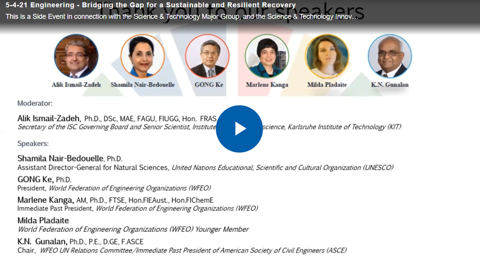 This Science & Technology Innovation (STI) Forum 2021 side event was organized by WFEO in collaboration with its Affiliate Member American Society of Civil Engineers (ASCE), and the International Science Council (ISC).