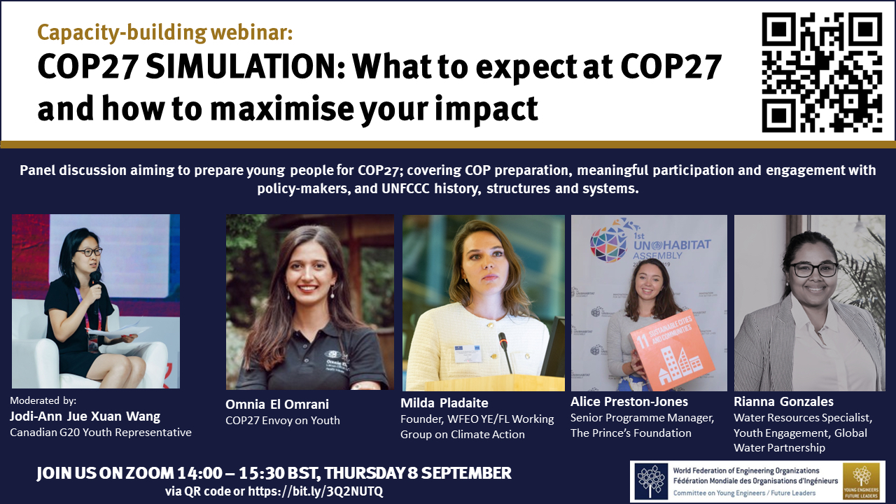The Working Group on Climate Action (WG on SDG13) of the WFEO Committee on Young Engineers / Future Leaders (YEFL) organized the Capacity-Building session entitled “COP27 SIMULATION: What to expect at COP27 and how to maximize your impact” on Thursday 8 September 2022.