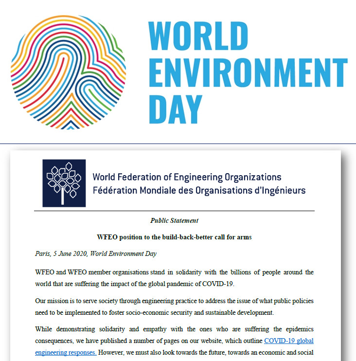As many stakeholders are now reflecting upon a “build-back-better” strategy after the COVID-19 crisis, and in the context of the World Environment Day celebrated on 5 June, WFEO issued a statement on economic recovery and climate change entitled “WFEO position to the build-back-better call for arms”, co-signed by WFEO President Gong Ke and the Chair of the WFEO Committee of Engineering and the Environment, Davide Stronati, that you can find in this link.