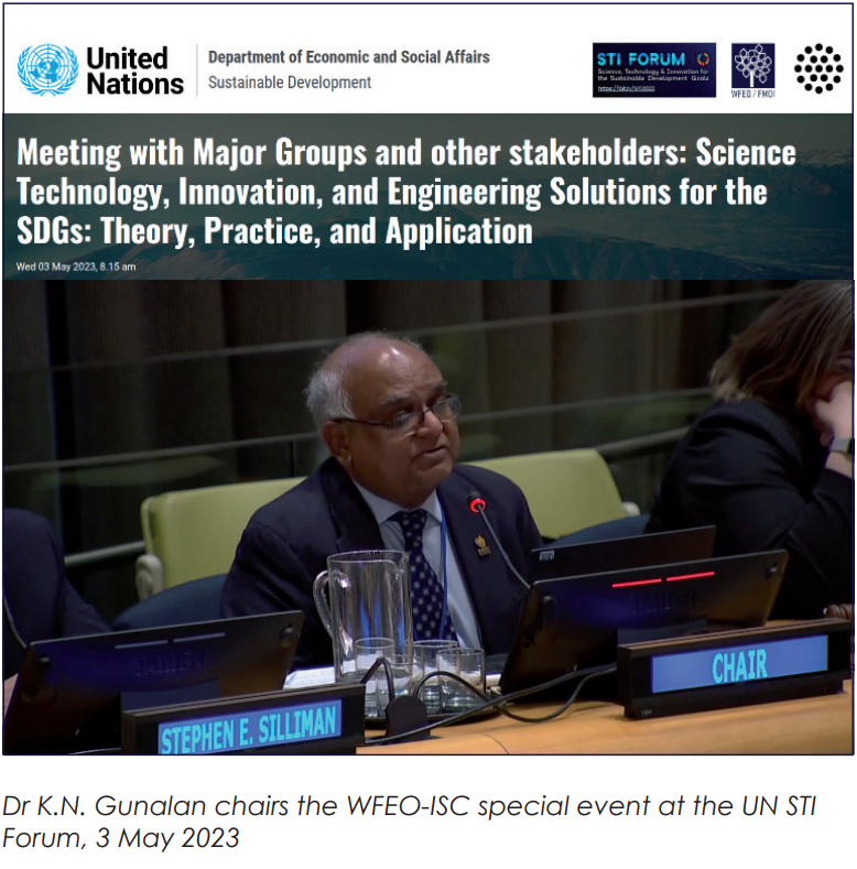 The WFEO UN Relations Committee (WURC) collaborates with the International Science Council (ISC) as co-Chairs of the Scientific and Technological Community Major Group and is actively engaging with the other 20 Major Groups and Other Stakeholders (MGoS) at the UN.
