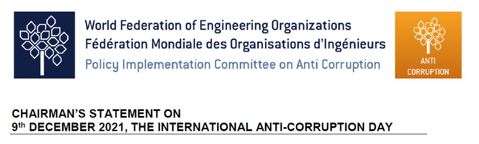 Today is International Anti-Corruption Day (https://www.un.org/en/observances/anti-corruption-day), an important event on our calendar. The theme of this year International Anti-Corruption Day is “Your right, your role: Say no to Corruption”. As part of the Engineering Community, the WFEO Committee for Anti-corruption (CAC) is marking the special Day focused on “Advocacy for Enhancement of Integrity Pacts in Infrastructure Projects as a game changer to Eradicate Corruption”. In making this statement, we acknowledge the unprecedented impact on economic and societal systems brought about by the onset of the global COVID-19 pandemic. At regional and national levels, this has affected the pace, scope and mode of our Anti- Corruption Strategy roll out.