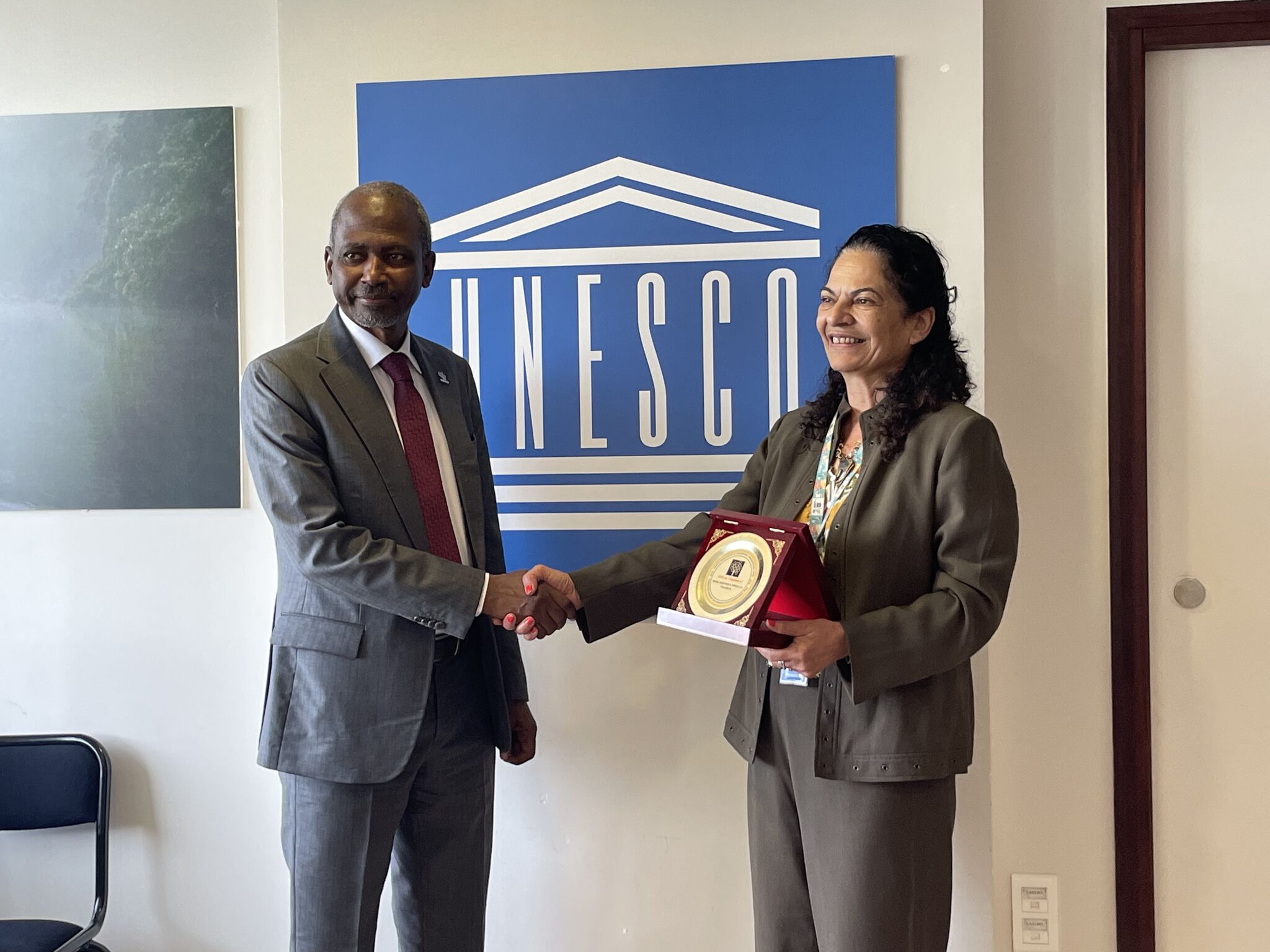 Mustafa Shehu offers Lidia Brito the WFEO plaque to commemorate the event