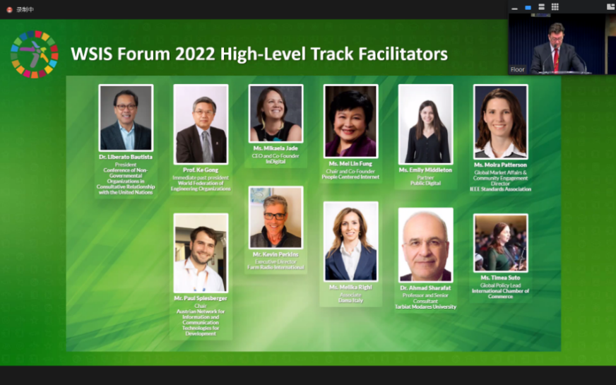 At the concluding session of the High-Level Track, WSIS Forum 2022 after the session, Prof. GONG was invited to make the HLPS 9 summary speech and introduce the vision, emerging trends identified, opportunities and challenges shared by the leaders of the session.