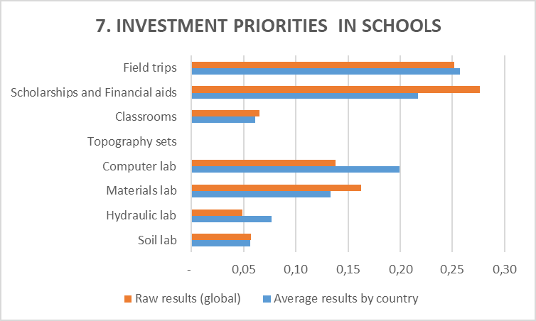 Interestingly, the survey does not back up the perception that there is a generalized shortage of civil engineering students. Although this might be true in some countries, the problem is not globally extended, as only 26% of the respondents perceived little interest in young students for this career (in contrast, 38.2% considered that there are too many teenagers interested in civil engineering). The respondents also believe that at this point, it would be wiser to invest in field trips and financial aid rather than lab equipment. Difficulties to work across borders, lack of social recognition, and competition with other professions are given beliefs that the survey confirmed right.