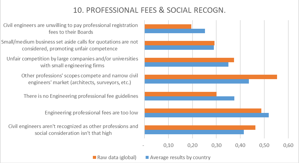 In summary, this survey has constituted the first step to systematic analysis to prioritize matters for discussion and to help sketch action plans for civil engineering associations. The conclusions could be enriched by further analyzing the correspondence between different answers and poking into the results country by country. Hopefully, this work may encourage others to deepen the research by collecting more information about specific subjects. In the end, this should help the engineering associations to allocate their resources more intelligently focusing the efforts on the challenges that matter the most to our practitioners.