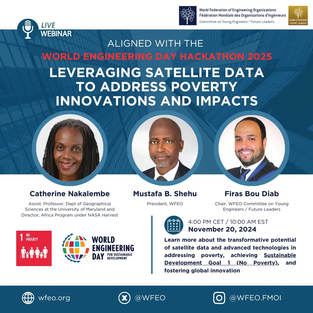 Continue Reading →The WFEO Committee on Young Engineers/Future Leaders (WFEO-YEFL) hosted the webinar “Leveraging Satellite Data to Address Poverty: Innovations and Impacts” on 20 November 2024.